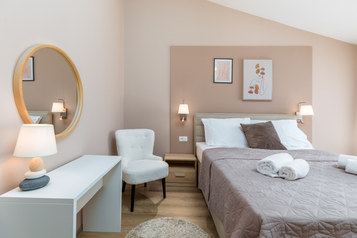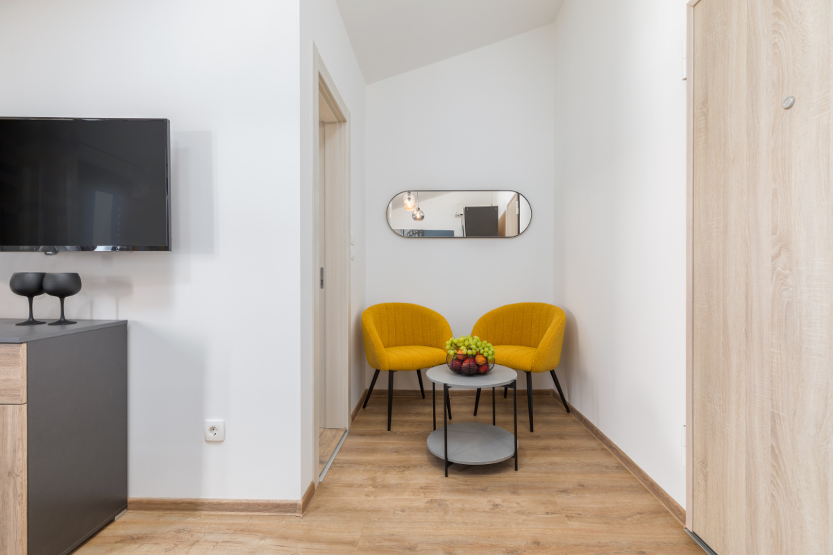 Naši klimatizirani apartmani moderno su opremljeni kako bi vam pružili maksimalnu udobnost. Svaki smještajni kapacitet uključuje aparat za kavu, hladnjak, sef, televizor ravnog ekrana te vlastitu kupaonicu s prostranim tušem. Balkoni s pogledom na vrt pružaju priliku za uživanje na svježem zraku u svakom trenutku.